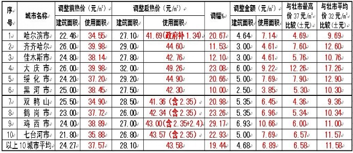 貫徹國家三部委和省政府關于啟動煤熱價格聯動機制要求,2008年哈爾濱、齊齊哈爾、佳木斯、大慶、雞西、雙鴨山、鶴崗、綏化等8城市都調整了熱價,2009年七臺河市、伊春市調整了熱價,2010年黑河市也調整了熱價,見下表: